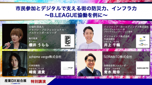 2025年7月30日(水)、東京ビッグサイトで開催された「産業DX 総合展」にて、特別講演セッション「市民参加とデジタルで支える街の防災力、インフラ力 ~B.LEAGUE協働を例に~」が行われました。