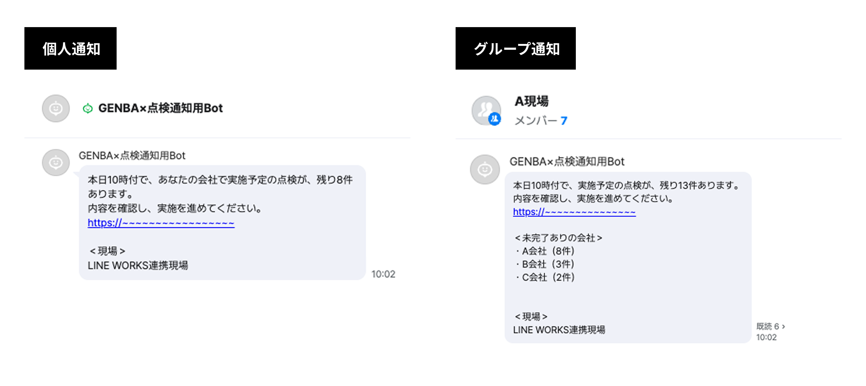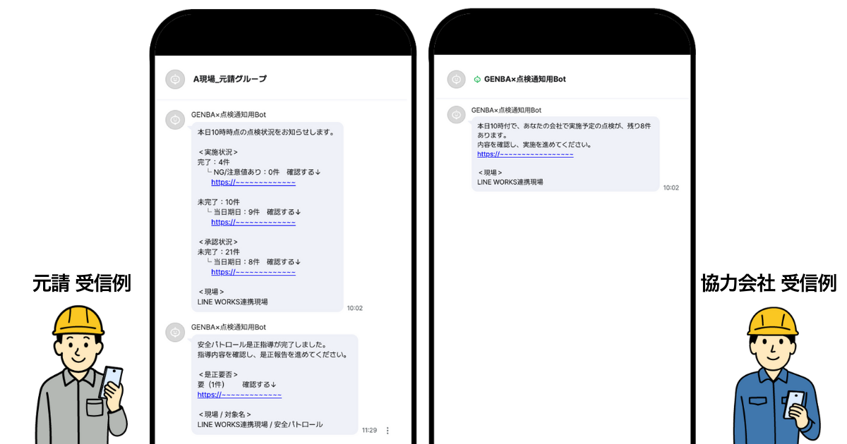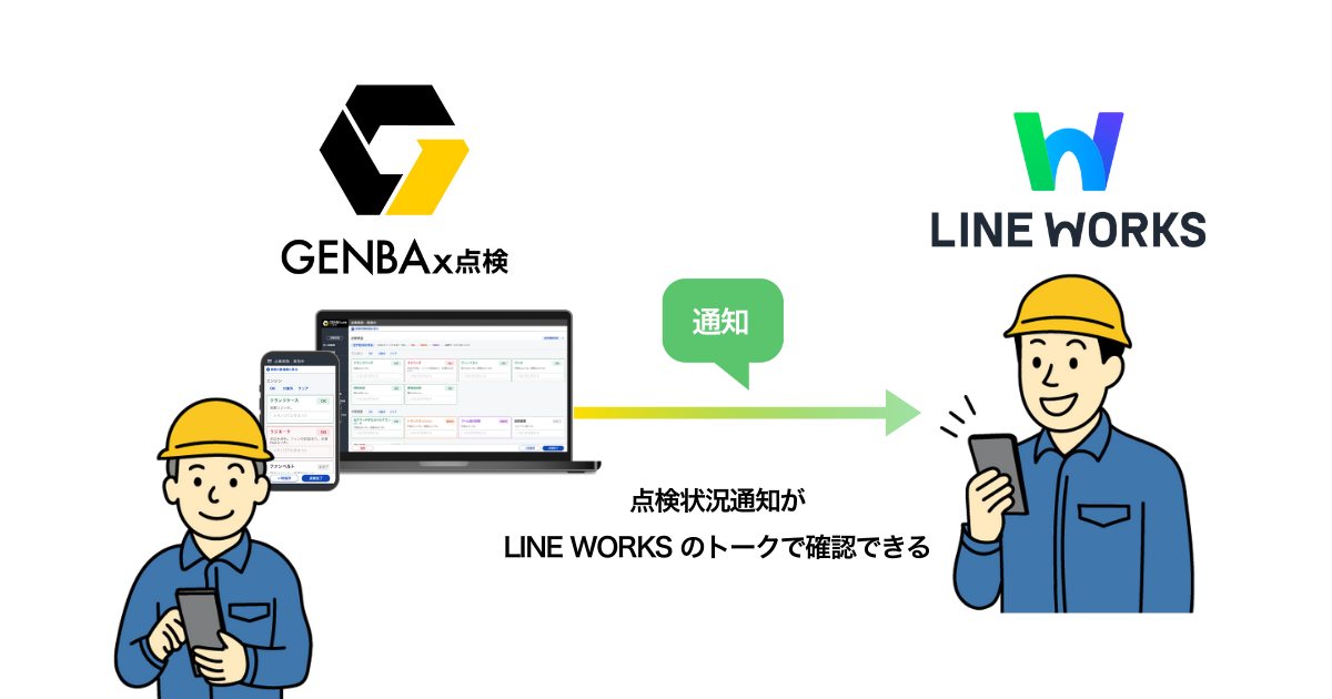 本連携により「GENBAx点検」から送られる各種通知が「LINE WORKS」のトーク上で受け取れるようになります。