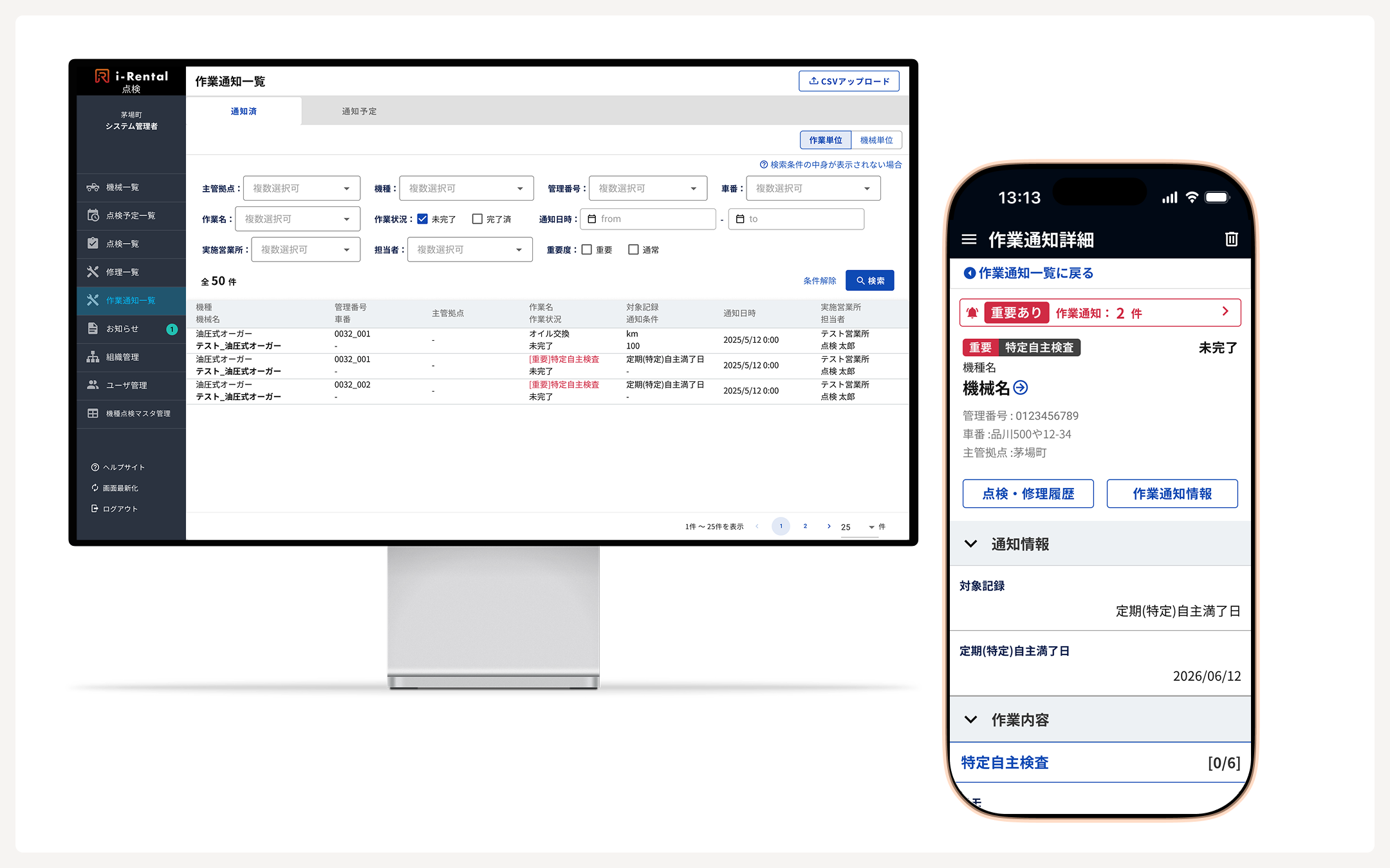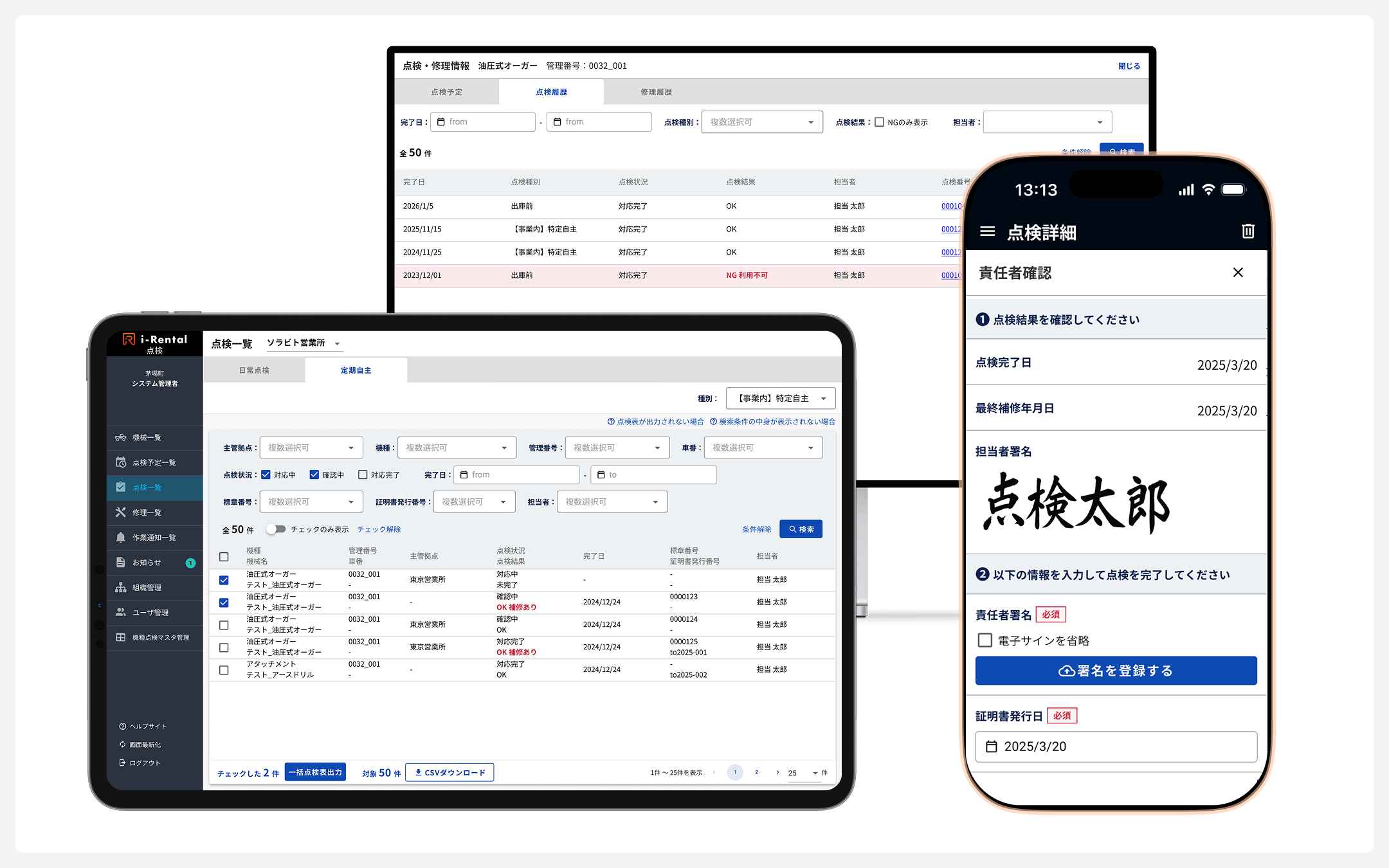 「i-Rental 点検」は、建設機械をはじめとした各種車両の点検表をペーパーレス化するサービスです。本サービスでは、1台の建設機械・車両に対して複数の点検結果、修理結果と写真を一括管理できるほか、点検種類(出庫点検、入庫点検、簡易点検、定期点検など)を任意にカスタマイズできるため、建機レンタル事業における点検業務の実態に即した運用が実現できます。スマートフォンやタブレット、パソコンなど、マルチデバイス対応となっており、整備士だけでなく、点検業務の管理者や貸出業務を担当するフロント担当などの内勤スタッフによる利用、営業担当による外部からのアクセスを可能にするなど、車両レンタル事業に関わるすべての方に使いやすい環境を提供しています。点検結果の登録作業の効率化、点検履歴検索の効率化のほか、点検・修理情報のリアルタイム共有などに寄与します。