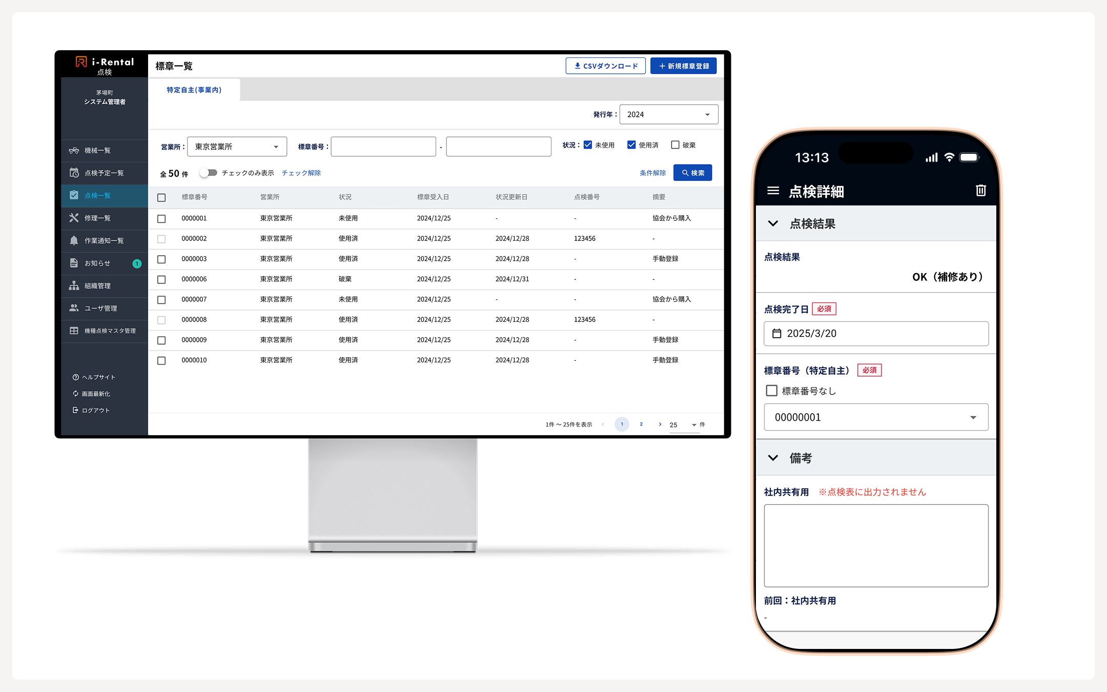 定期検査を含む特定自主検査標章の受払・在庫管理(受入・払出・残数・廃棄数など)から、機械ごとの検査状況・担当者の紐付け管理まで一元化。証明書発行番号に基づいた詳細な実施データ管理にも対応し、煩雑な事務作業を大幅に効率化します。